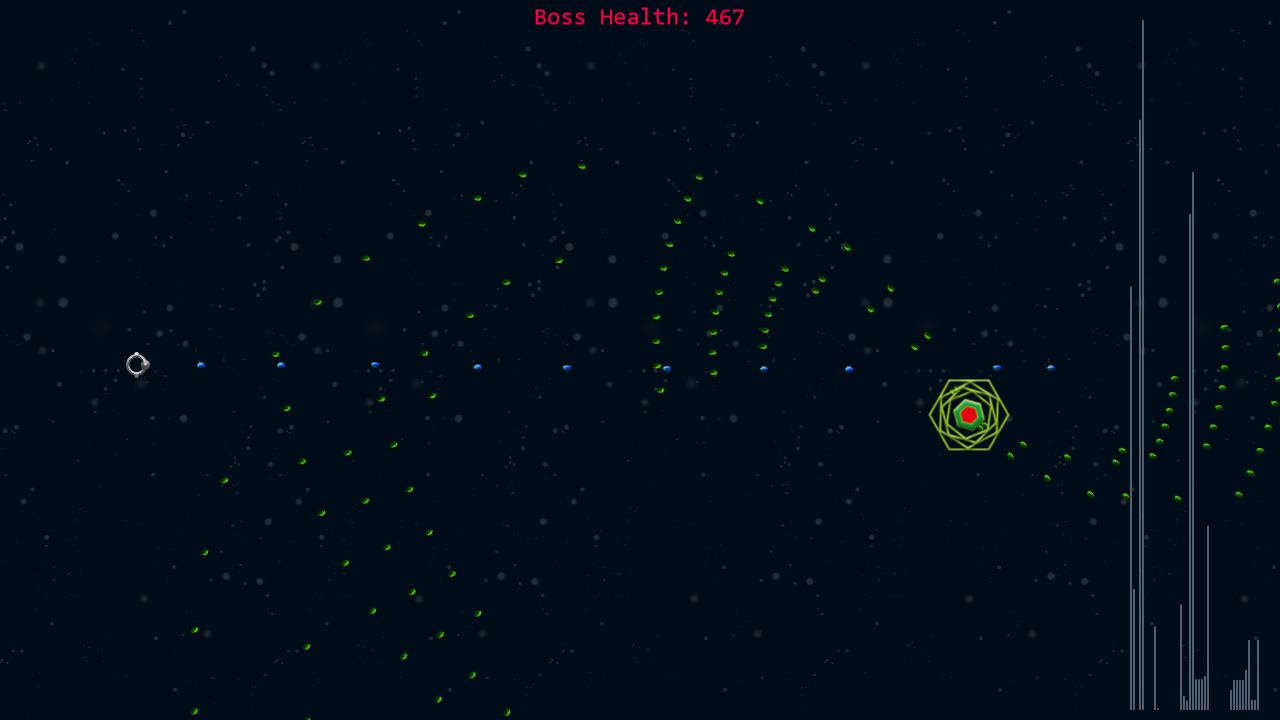 Wir würden unser Spiel soweit programmieren wollen, dass nur ein Gegner (Endgegner) zu bekämpfen ist. Am Anfang des Spiels soll der Spieler entscheiden woher das Spiel die Daten nehmen soll um das Projektilmuster des Gegners zu generieren. Welche Daten genau genommen werden steht noch offen; Es wäre aber eine Idee beispielsweise die Tagesanzahl eines Twitter-Hashtags in einem bestimmten Zeitraum zu verwenden. Wurde hier der Hashtag sehr oft benutzt könnte das Muster komplexer und dichter werden.