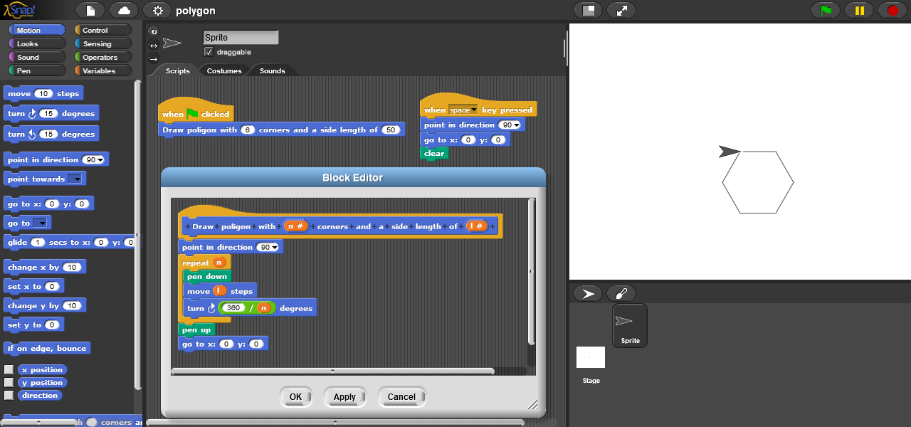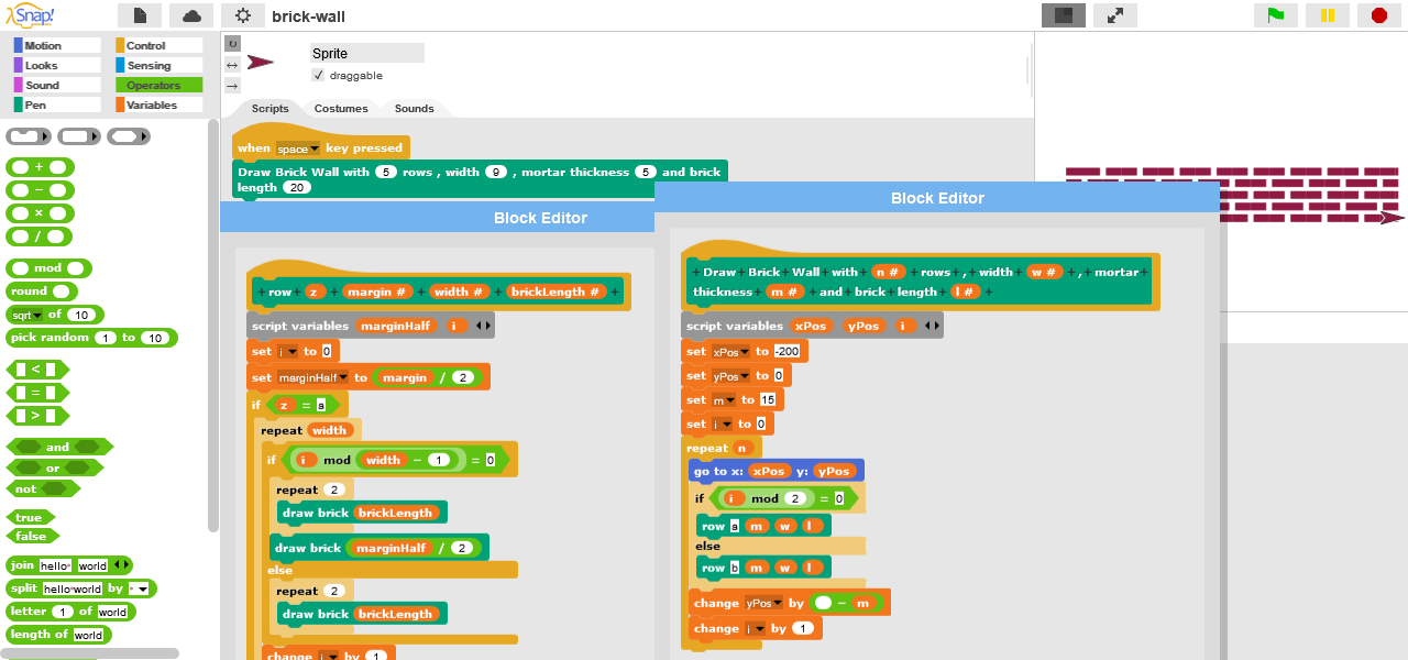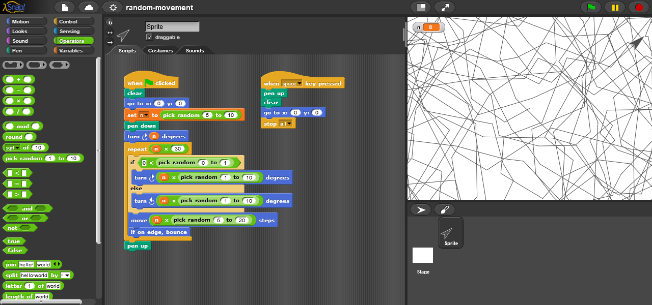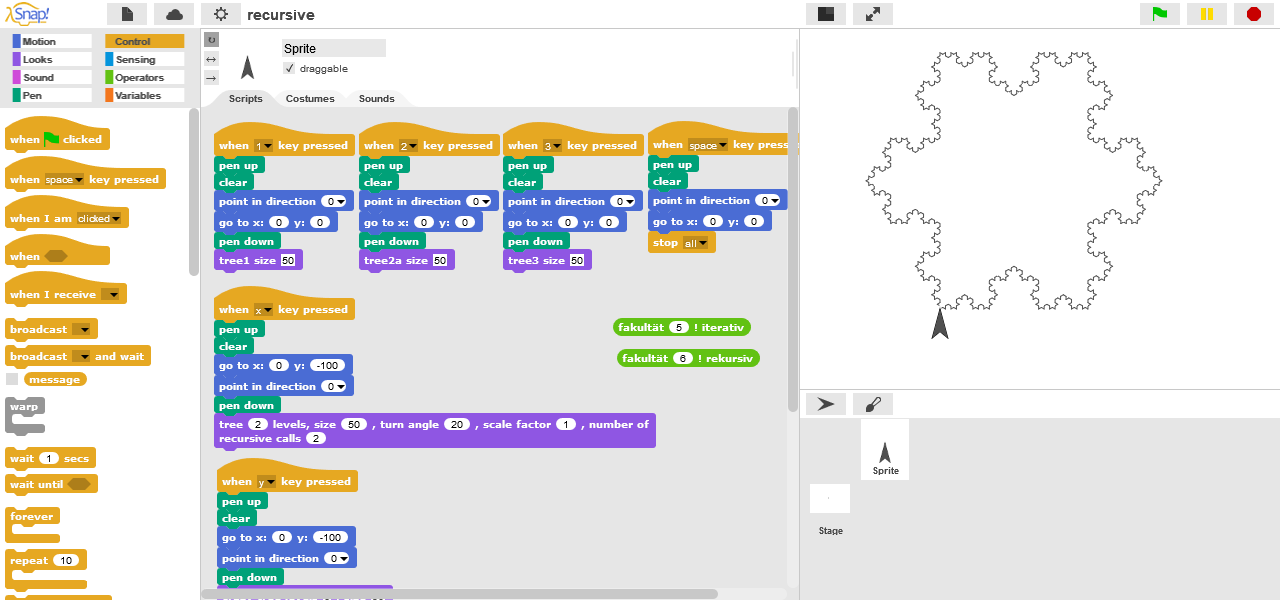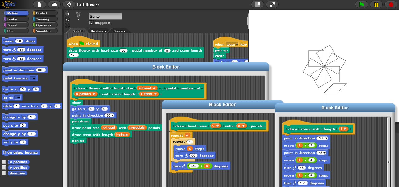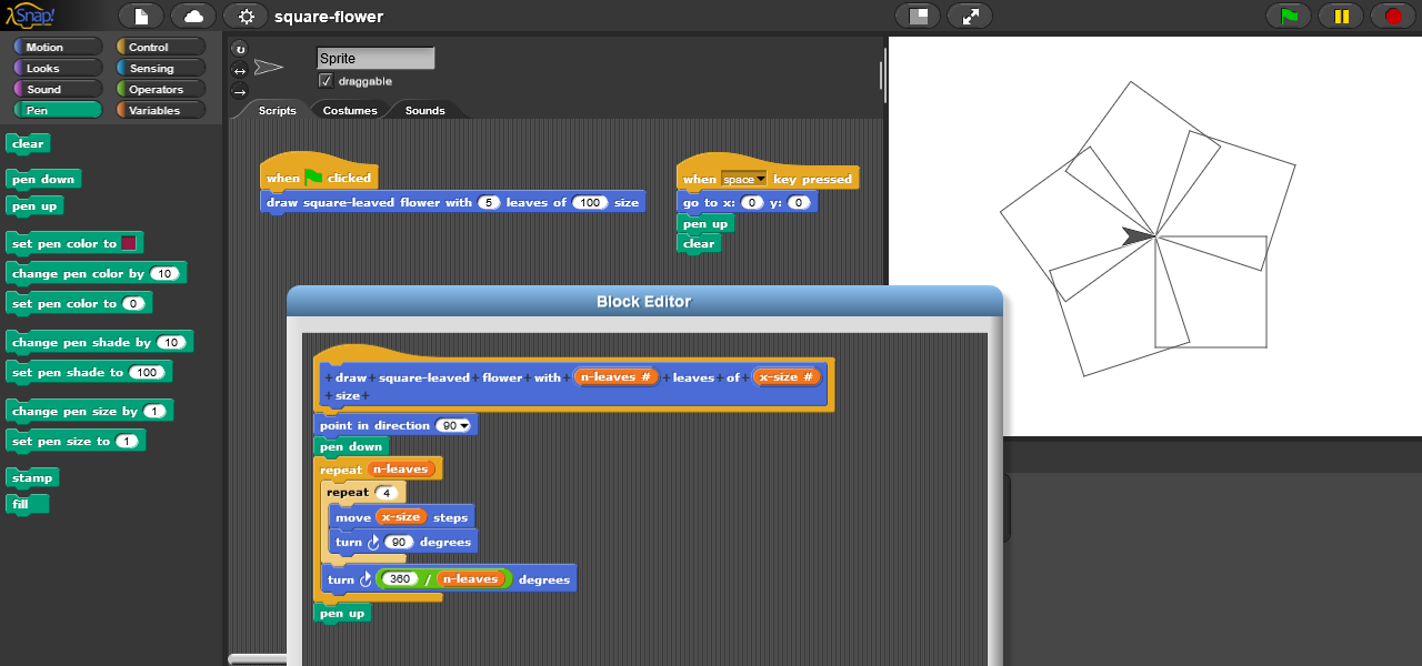 Polygon-Funktion und Block Editor in Snap!Funktion um mit Quadraten eine Blume zu machen in Snap!Eine Blume mit Stamm in Snap!Zufallsbedingte Bewegungen in Snap!