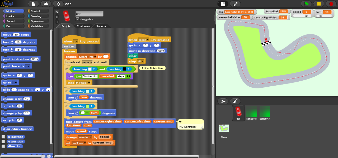 Ich habe dementsprechend für jeweils die rechte und linke Seite des Autos einen Sensor hinzugefügt die die Distanz zum Straßenrand messen. Anhand dieser Messungen regelt der PID-Regler wie das Auto lenken soll. Hier wird 'I' nicht verwendet, da ein PD-Regler ausreichend ist.