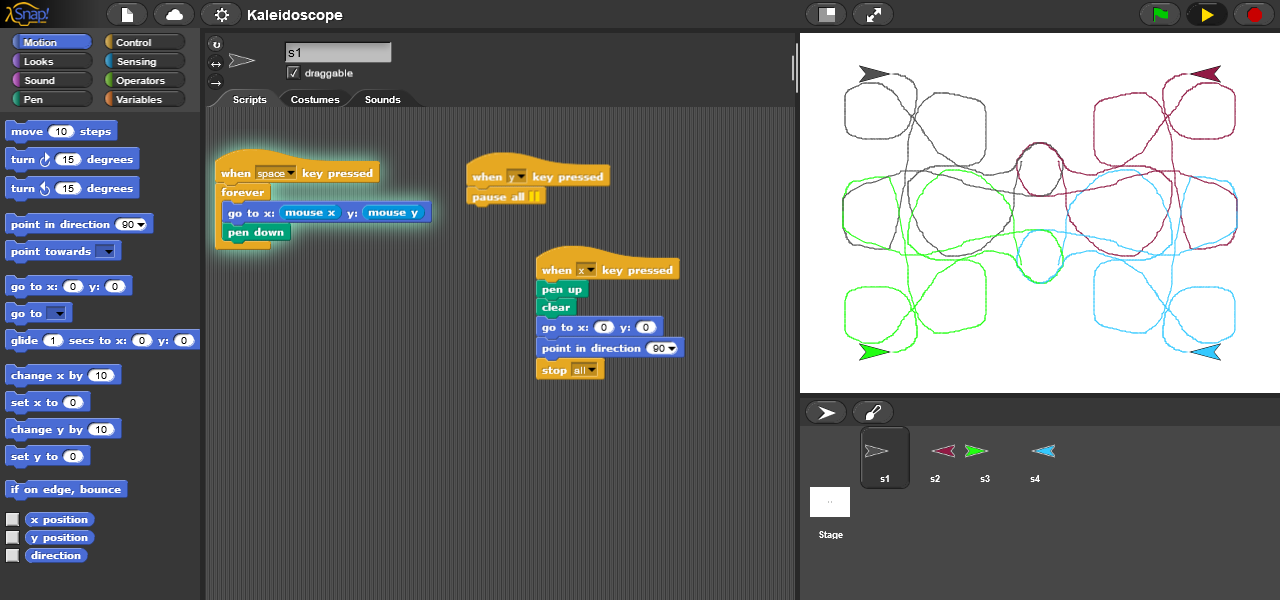 Die erste Übung mit Snap! war anhand dieser Aufgabe eine Kaleidoskop-Funktion zu programmieren.